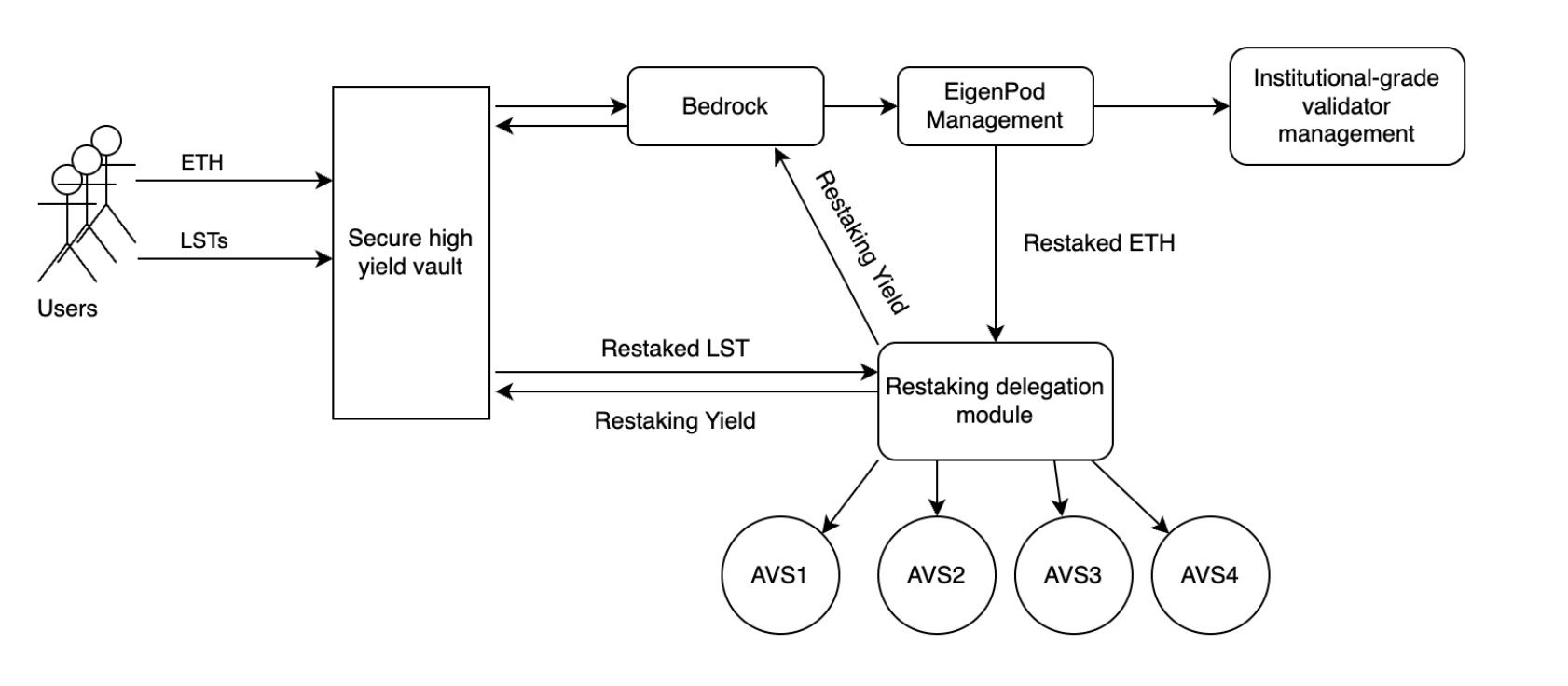<figure><img src="https://content.gitbook.com/content/nrckfSpUo53lwAbTsRSv/blobs/wl5HHyfXiJl2cgRx281U/bedrock-architecture.png" alt=""><figcaption><p>Bedrock Liquid Restaking architecture</p></figcaption></figure>