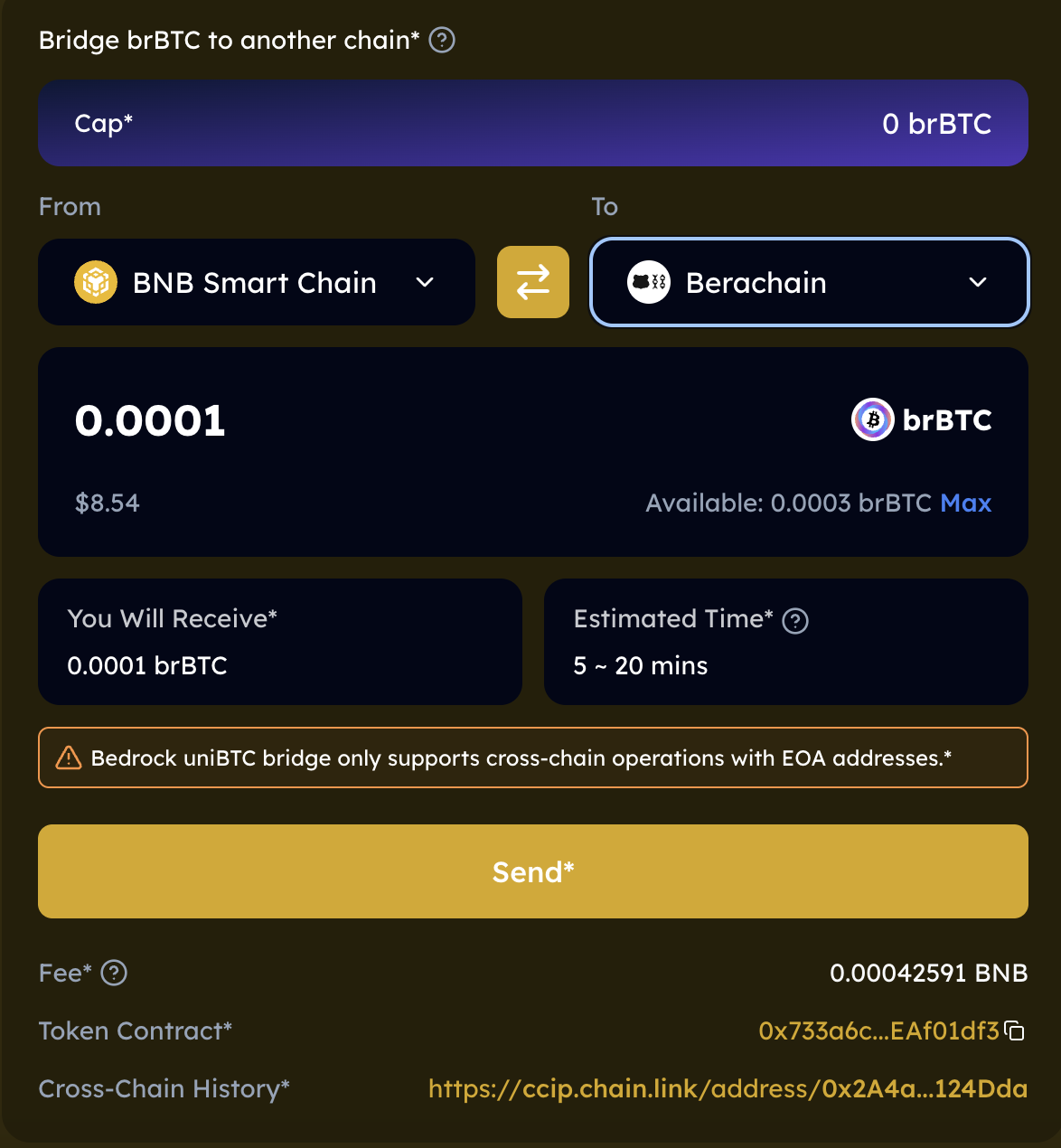Enter amount of brBTC to be bridged to the dest. chain.