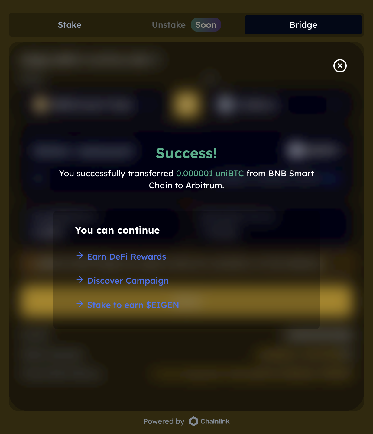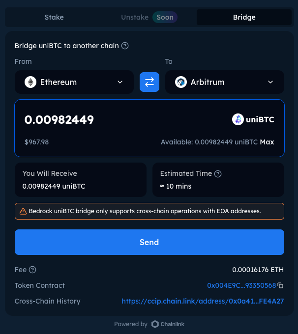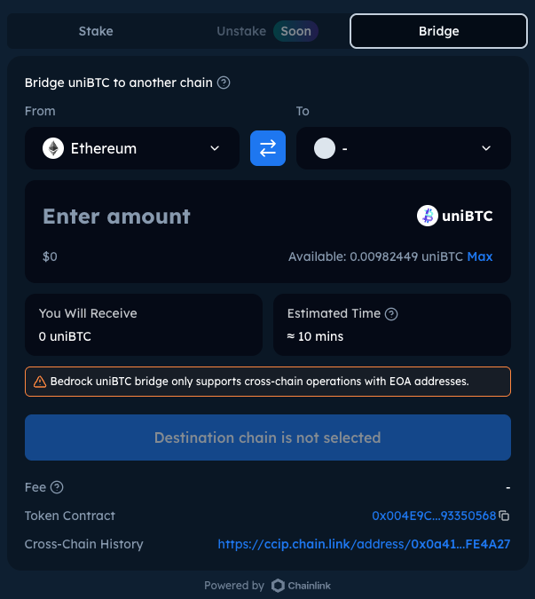 Enter amount of uniBTC to be bridged to the dest. chain.