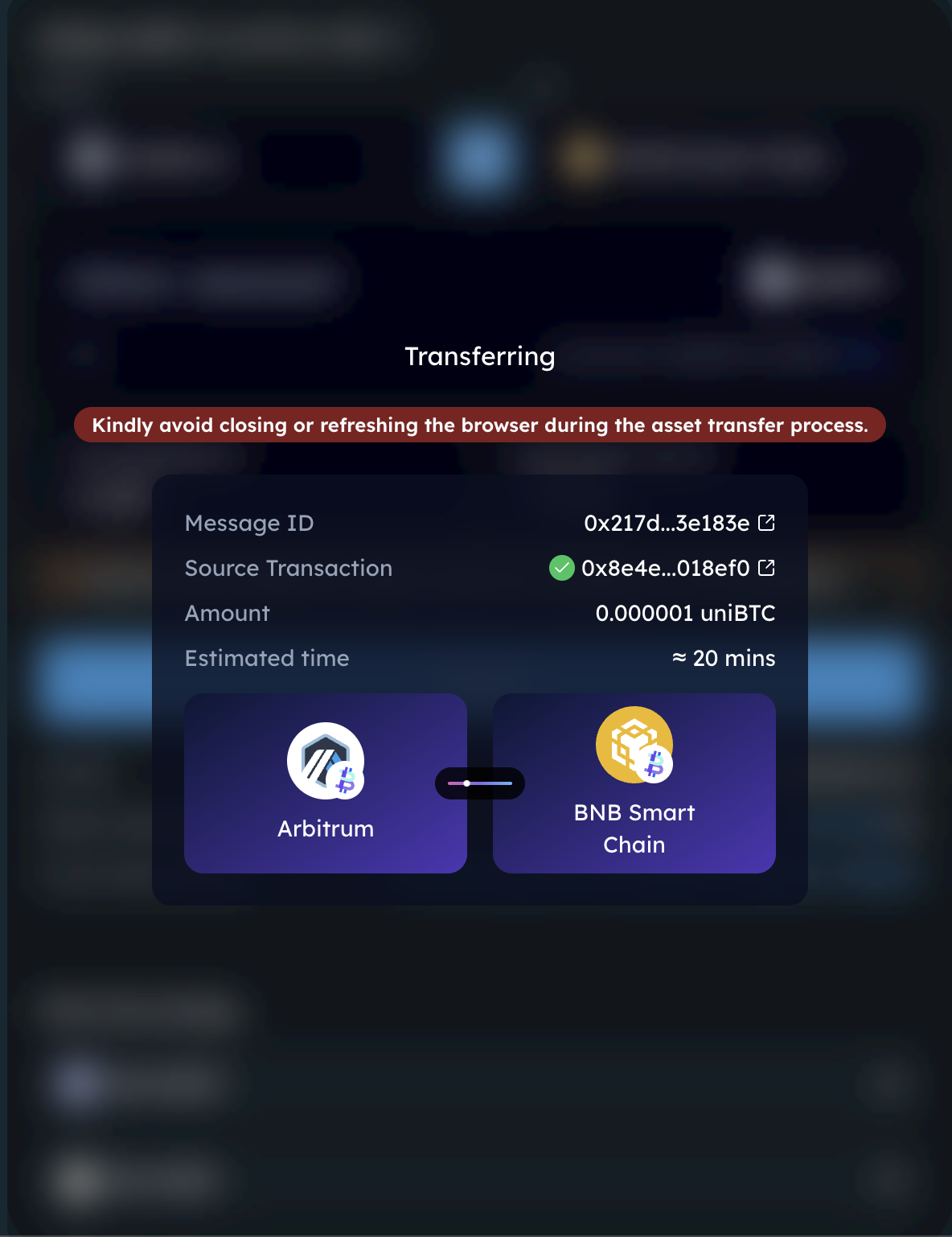Transfer success popup: Upon transaction finality confirmation, it shows below info: