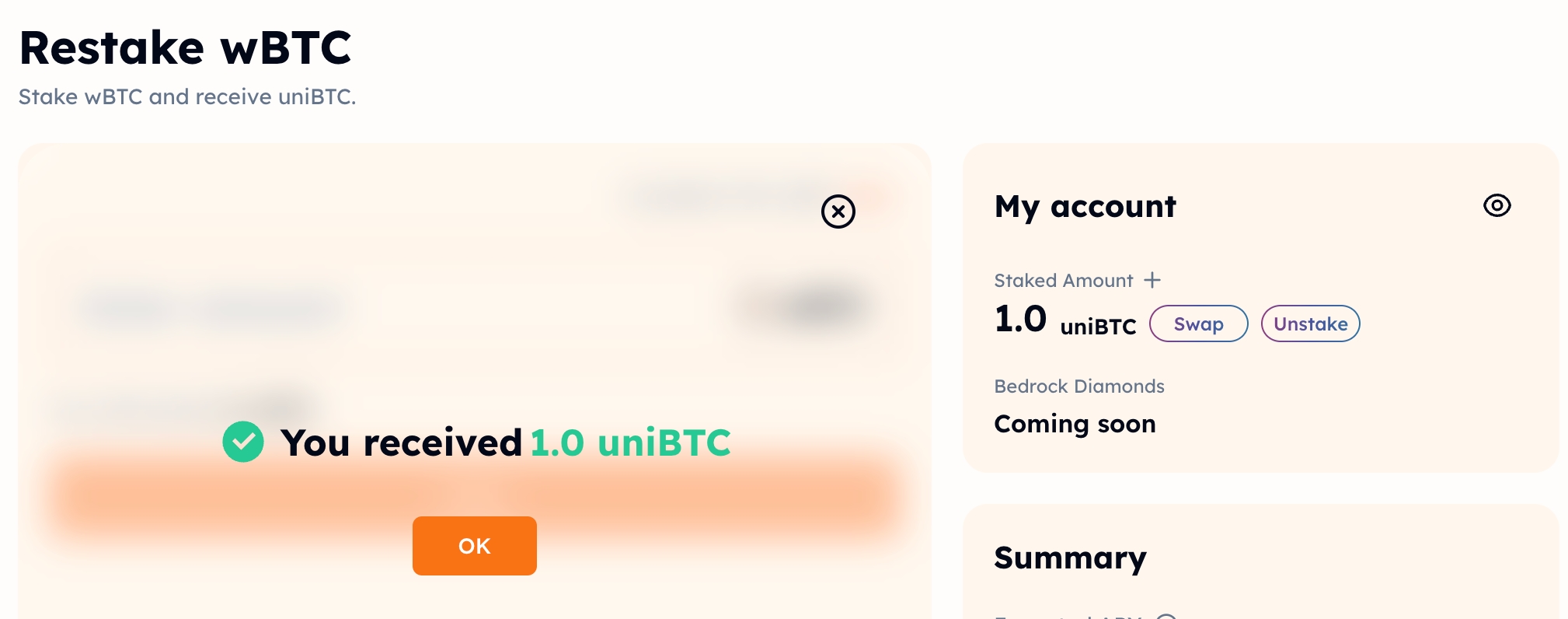 Bedrock allows everyone the opportunity to earn rewards on any amount as we do not have a minimum amount required to use the Bedrock protocol. We do recommend a deposit of at least 0.005 wBTC to make your transaction worthwhile. When you stake wBTC, you will receive uniBTC, which represents staked wBTC.