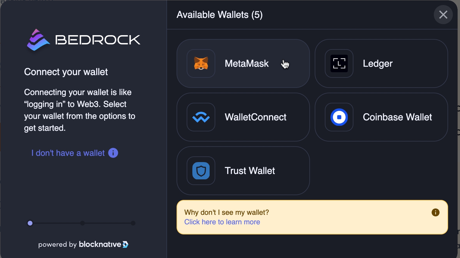 To stake your wBTC for uniBTC in Bedrock, click 'Connect Wallet' at the top of the page to link your preferred wallet (MetaMask in this tutorial) to the dApp. Once connected, the mint/withdraw function for uniBTC will be available.